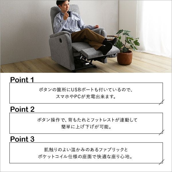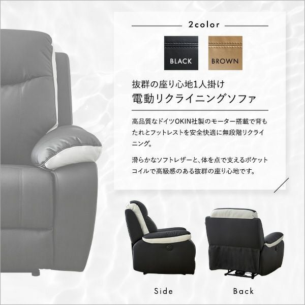 他の画像を見る 電動ソファ ソファ 一人掛け リクライニング リビング レザー フットレスト 1P ポケットコイル 両肘 北欧 モダン おしゃれ 抜群の座り心地!1人掛け電動リクライニングソファ[SH-24-ESL-1] ¥ 54,900 税込 お気に入りに登録する