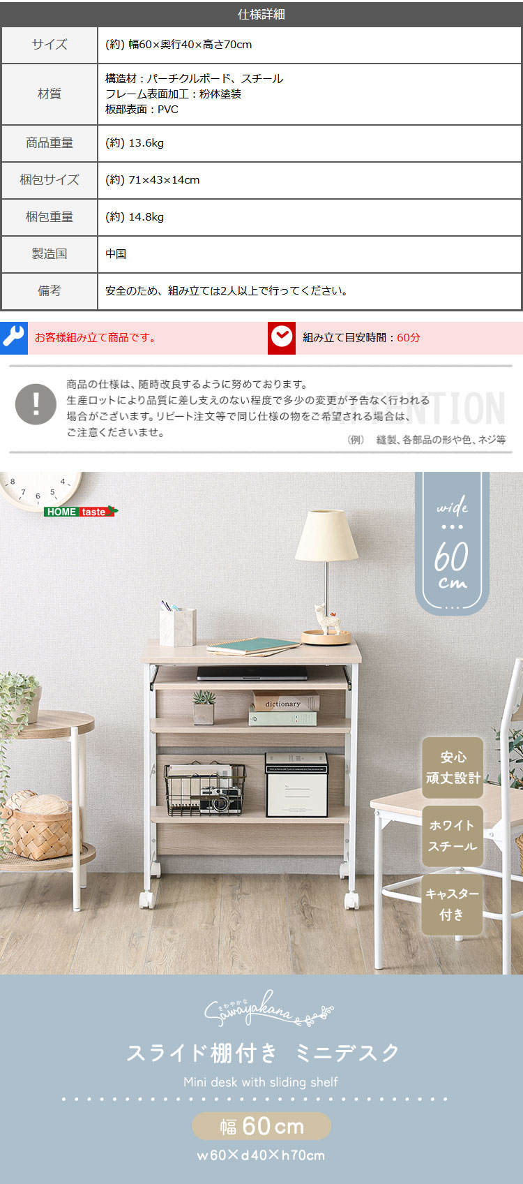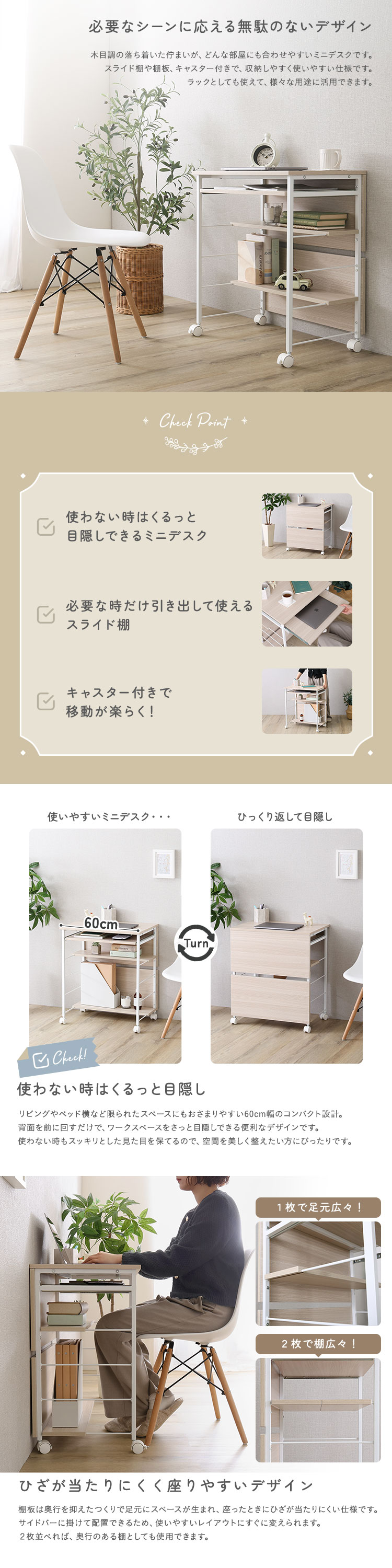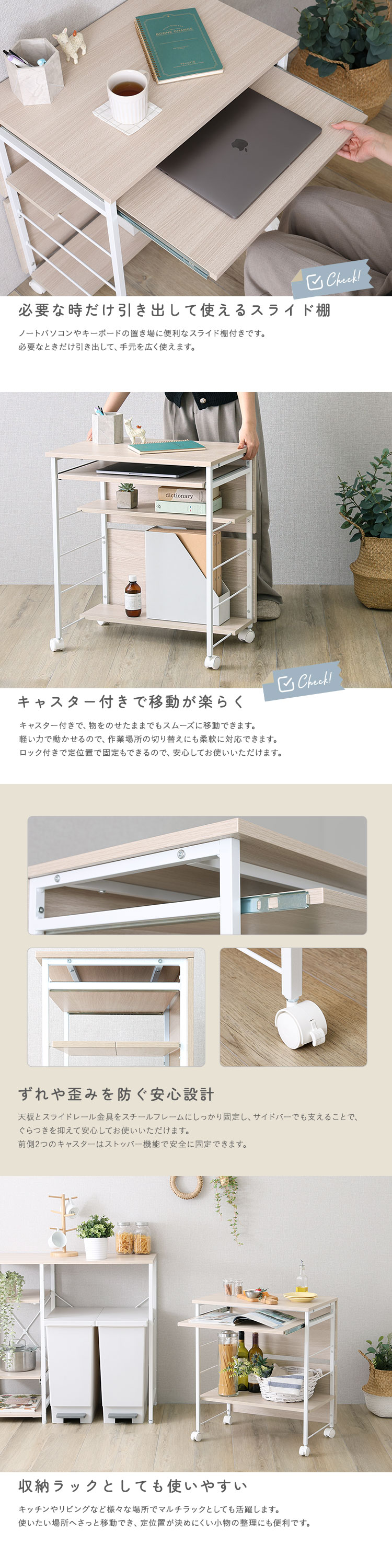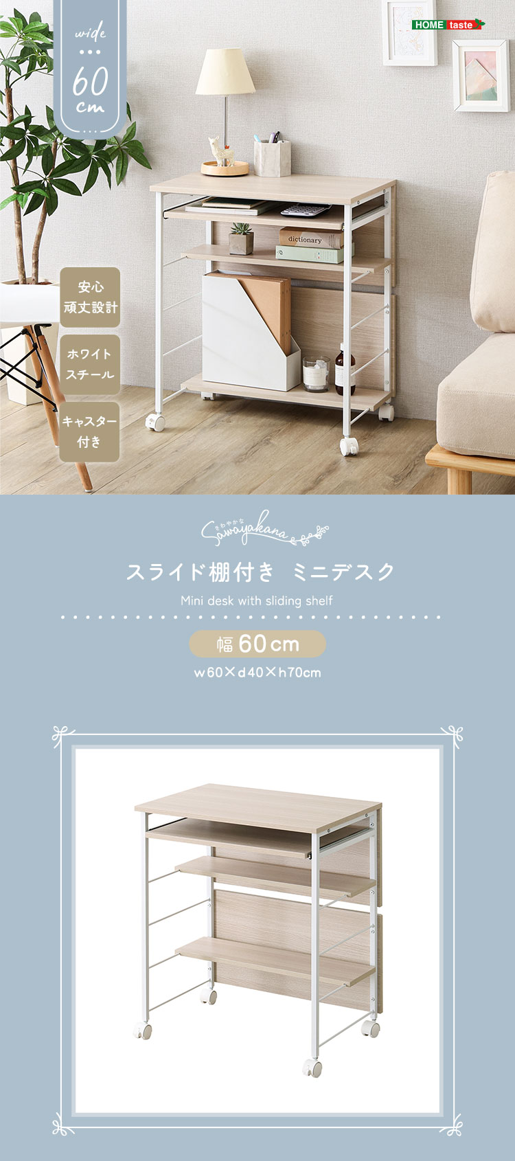 パソコンデスク 幅60cm 収納 スライドトレー 勉強机 在宅 キャスター 収納ラック 可動棚 木目調 作業机 座卓 キャスター付き 棚付き パソコンラック パソコン机 さわやかな スライド棚付きミニデスク [FDDZ]