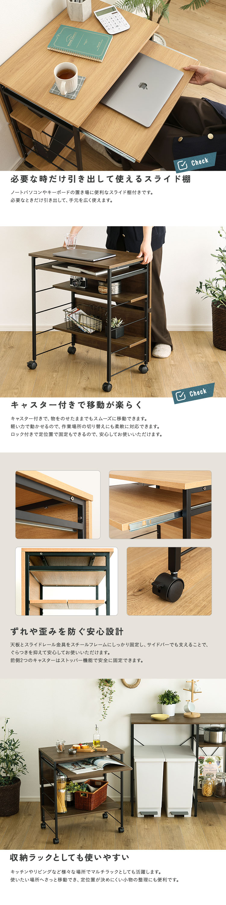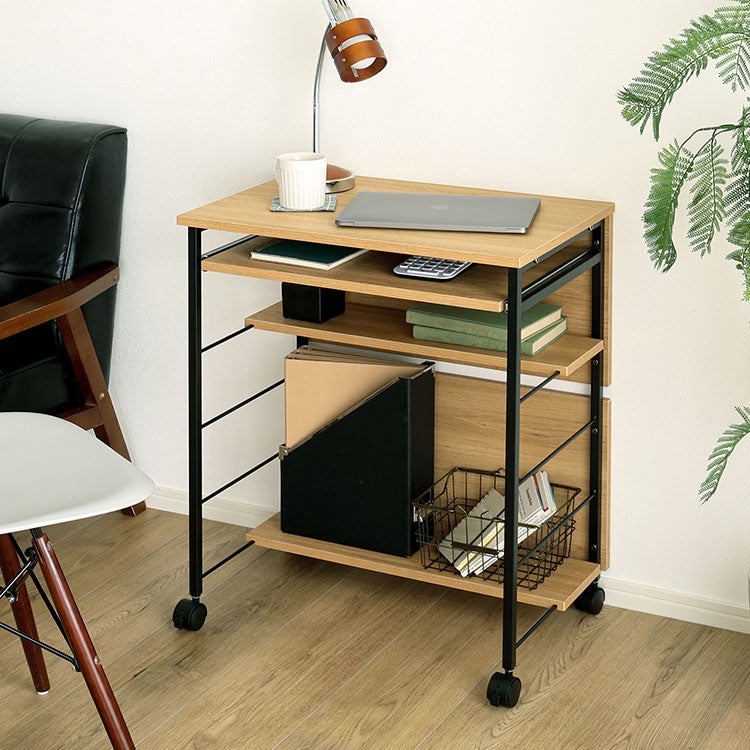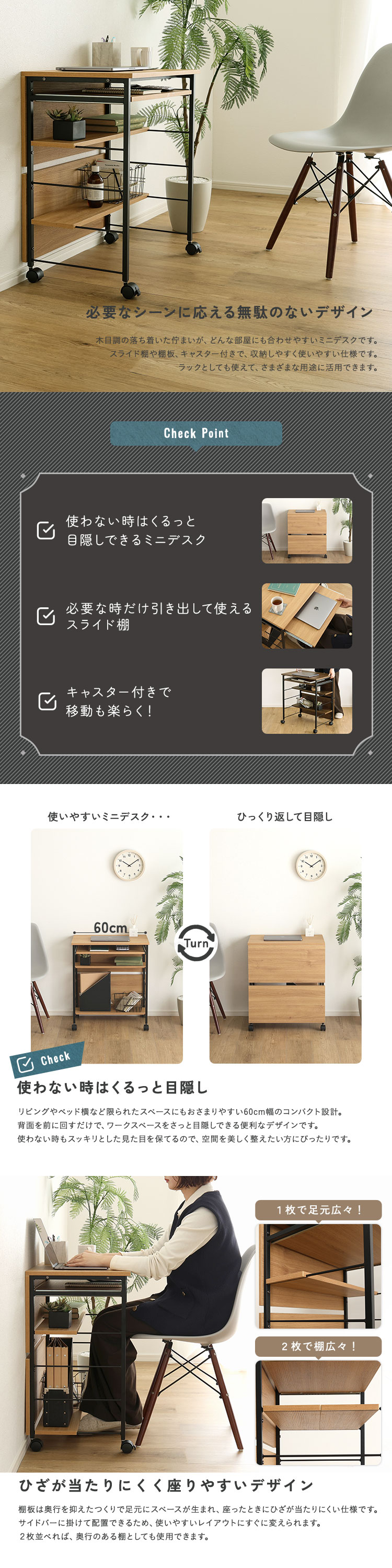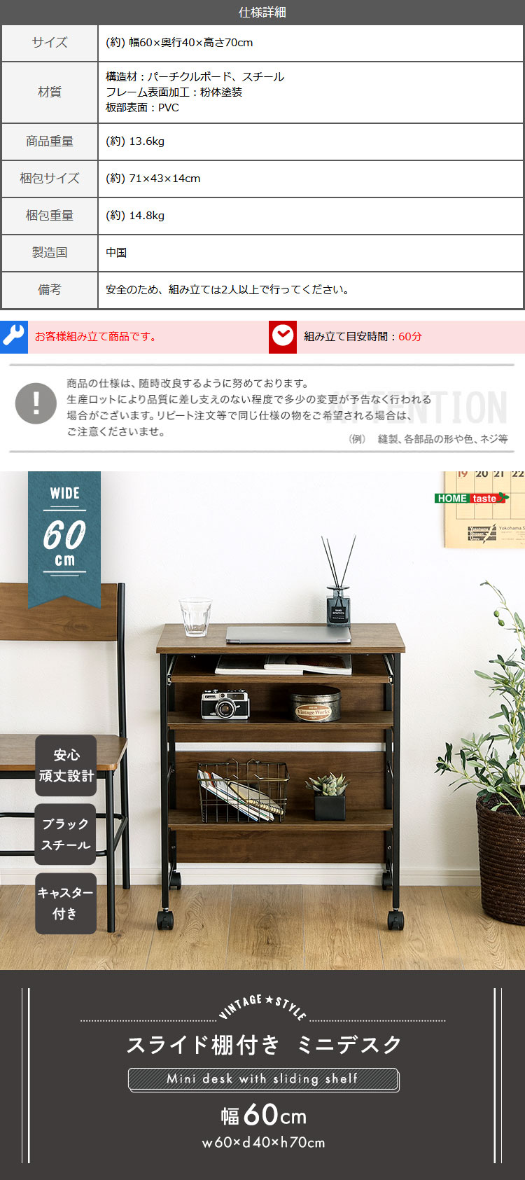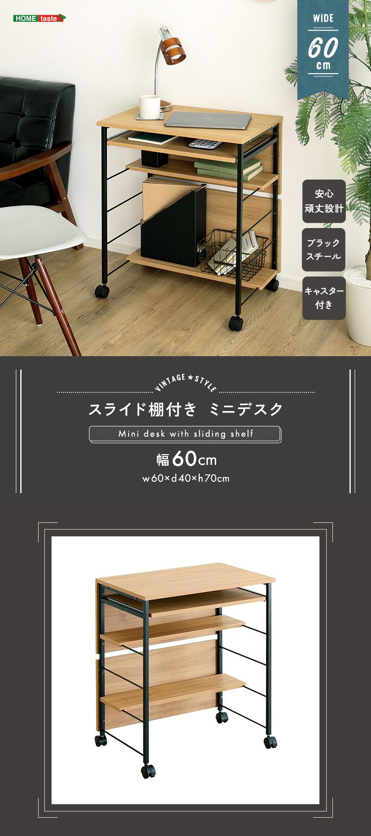 パソコンデスク 幅60cm 収納 スライドトレー 勉強机 在宅 キャスター 収納ラック 可動棚 木目調 作業机 座卓 キャスター付き 棚付き パソコンラック パソコン机 ヴィンテージ調 スライド棚付きミニデスク [VDDZ]