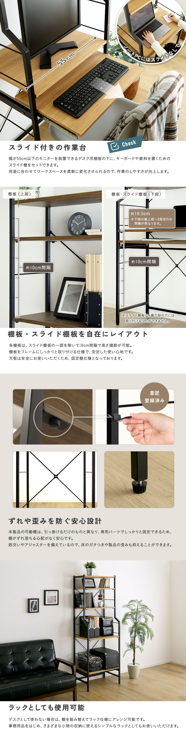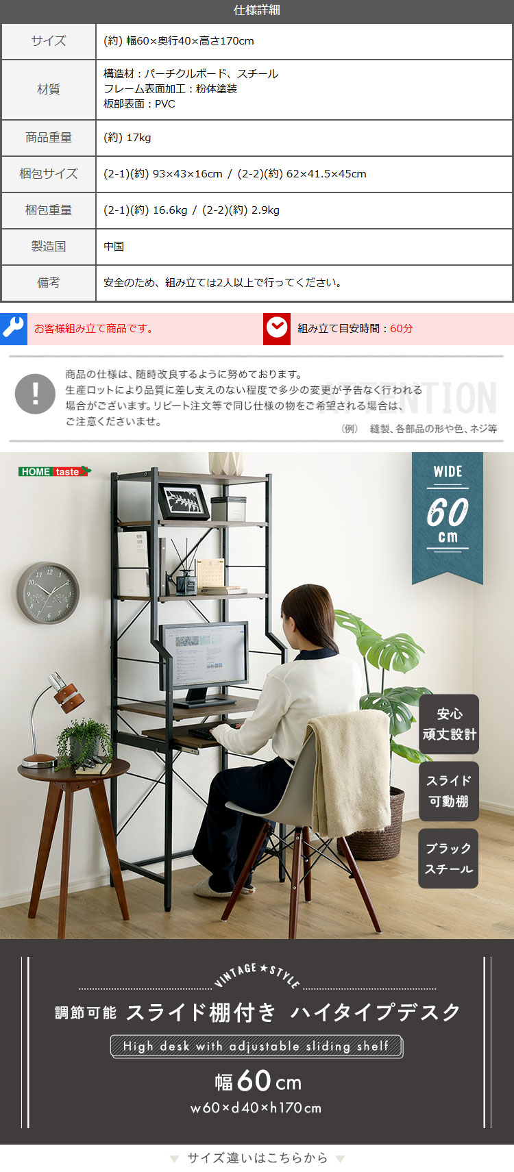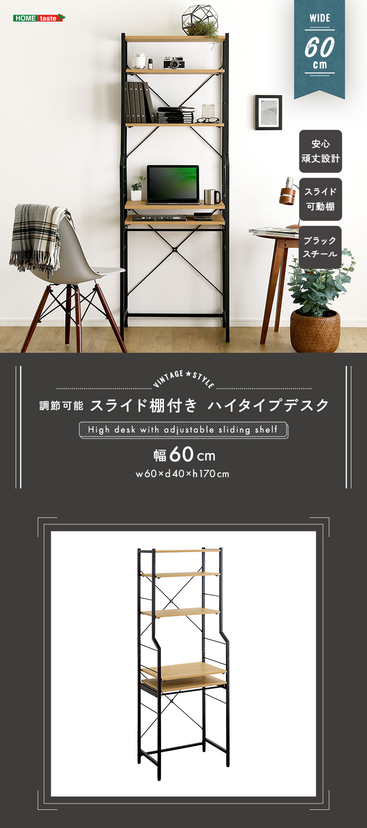 ハイタイプ スリムデスク デスク 省スペース 可動棚 収納 おしゃれ 60幅 ラック 収納棚 壁面収納 デッドスペース ヴィンテージ調 調節可能スライド棚付きハイタイプデスク [VDZ-60]