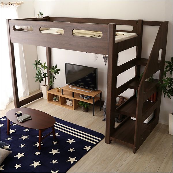 インテリア ベッド ロフトベッド 階段付き 宮棚付き 収納 木目調 すのこ床 通気性 耐荷重300kg ロフト下に自由な空間を ナチュラル ウォールナット 階段付きロフトベッド YOUICK-ユーイック- [HT-0600]