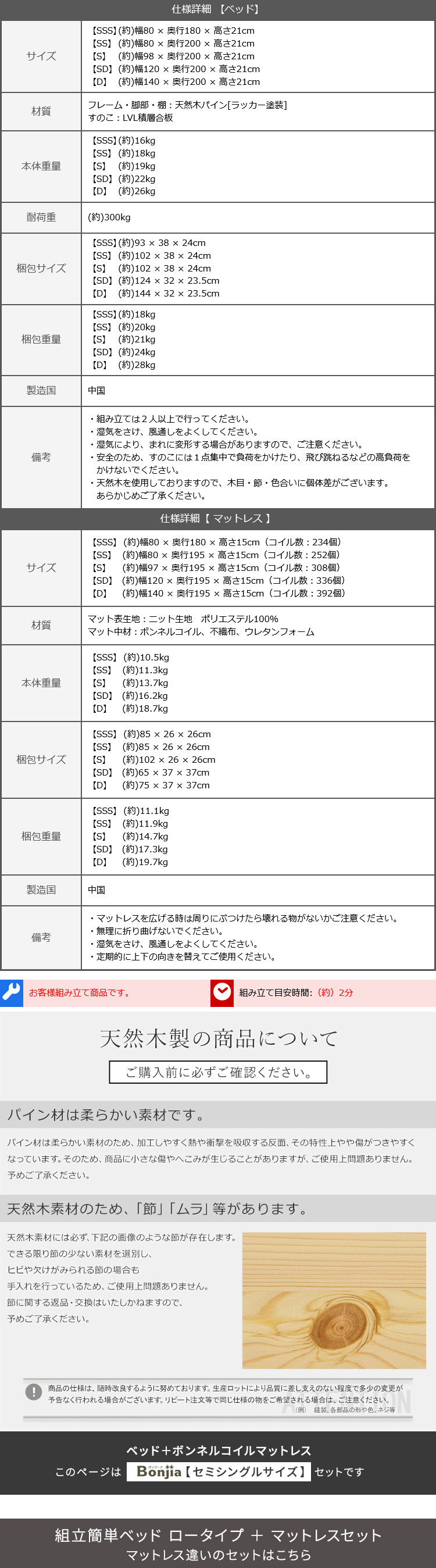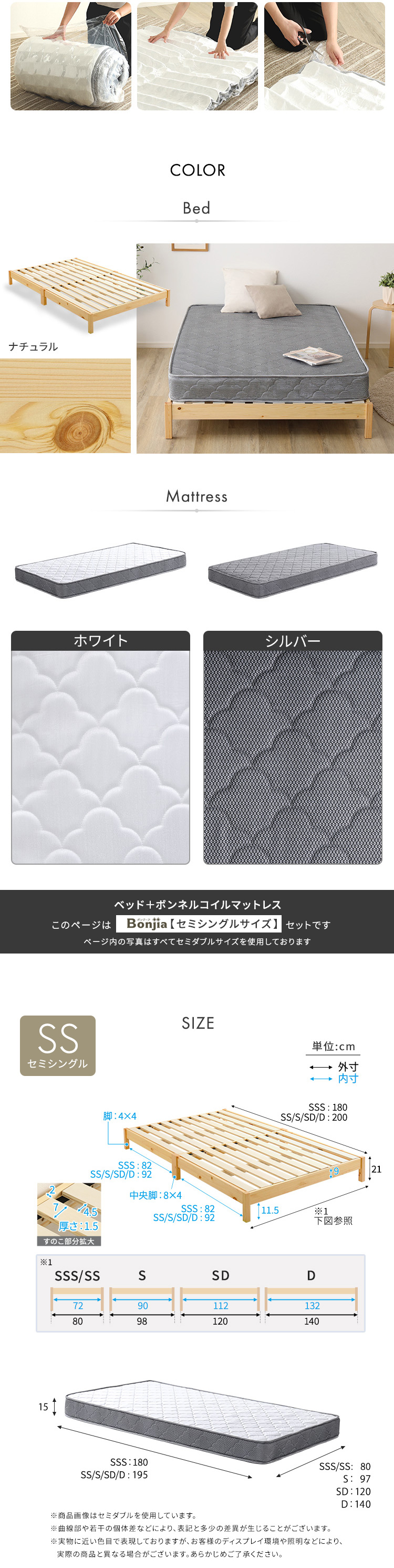 マットレスSS:(約)幅80×奥行195×高さ15cm(コイル数:252個)