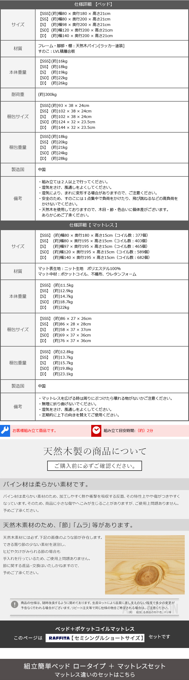 マットレスSSS:(約)幅80×奥行180×高さ15cm(コイル数:377個)