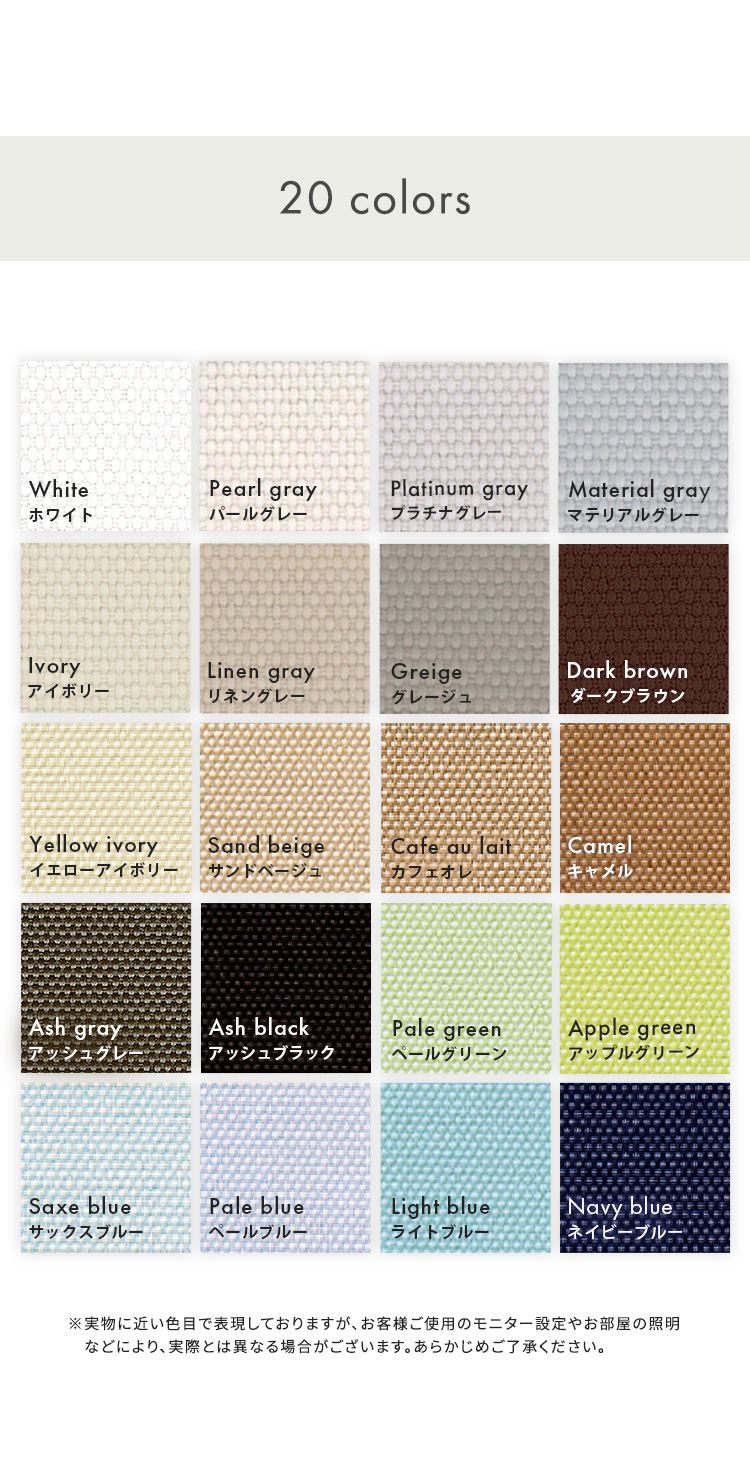ホワイト、プラチナグレー、パールグレー、サンドベージュ、アイボリー、マテリアルグレー、カフェオレ、アッシュグレー、アップルグリーン、リネングレー、イエローアイボリー、グレージュ、ペールグリーン、ペールブルー、アッシュブラック、サックスブルー、ダークブラウン、ネイビーブルー、ライトブルー、キャメル