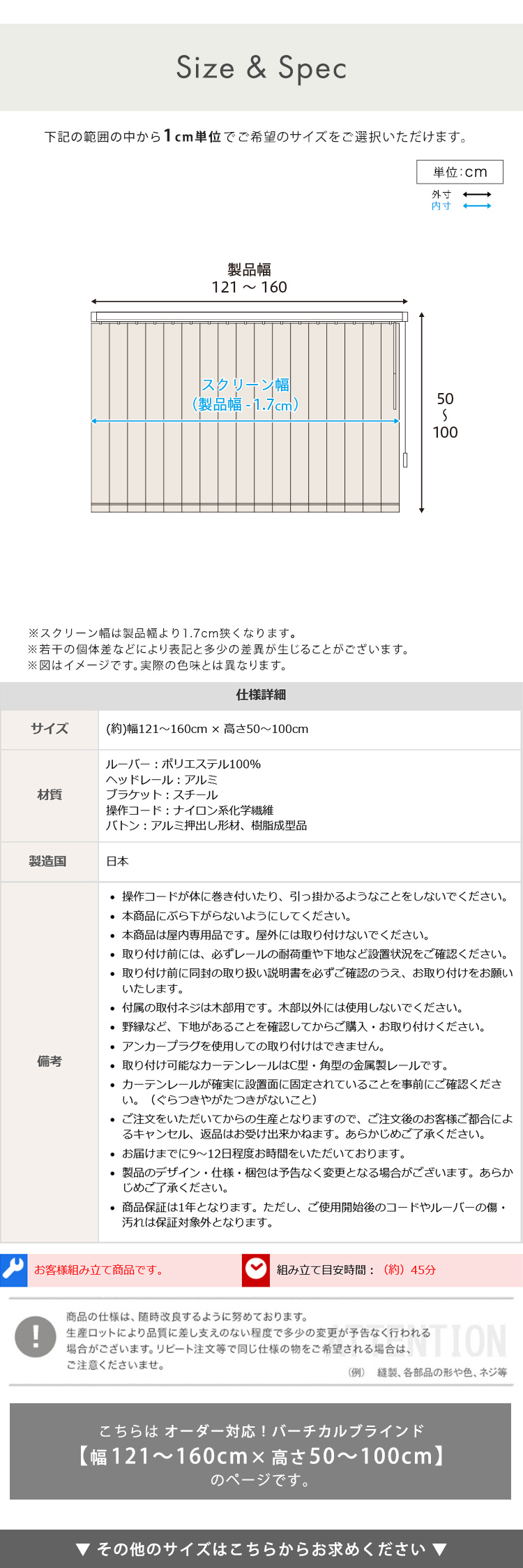 オーダー バーチカルブラインド 縦型ブラインド カーテン 防炎 カーテンレール取付 賃貸可能 日本製 おしゃれ ナチュラル 北欧 工事不要 1cm単位のオーダー対応!バーチカルブラインド 幅121~160cm×高さ50~100cm [SH-29-VBOD-6]