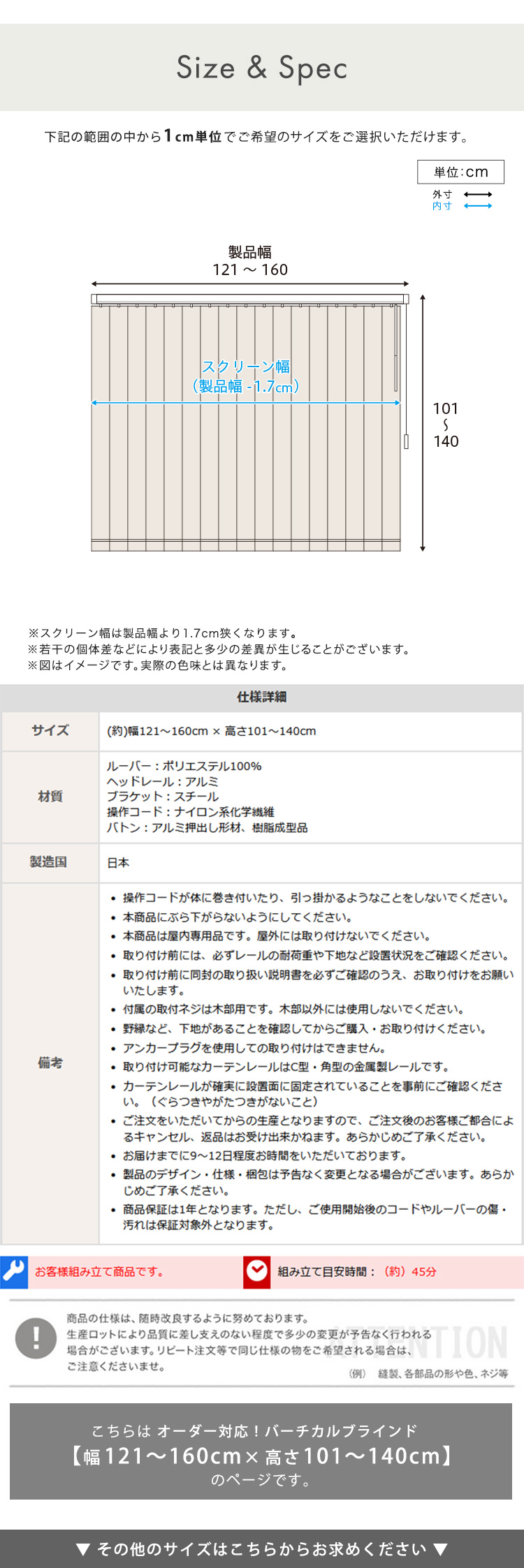 オーダー バーチカルブラインド 縦型ブラインド カーテン 防炎 カーテンレール取付 賃貸可能 日本製 おしゃれ ナチュラル 北欧 工事不要 1cm単位のオーダー対応!バーチカルブラインド 幅121~160cm×高さ101~140cm [SH-29-VBOD-7]