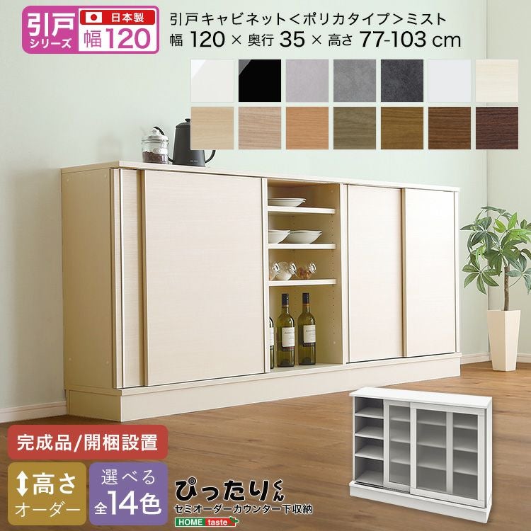 カウンター下収納 キャビネット 引戸 キッチン リビング 玄関 高さオーダー 14色 幅120cm 奥行35cm セミオーダー 日本製 完成品 開梱設置 【引戸シリーズ】セミオーダーカウンター下収納ぴったりくん キャビネット(ポリカタイプ ミスト) 幅120cm×奥行35cm [SH-19PSG120M35]