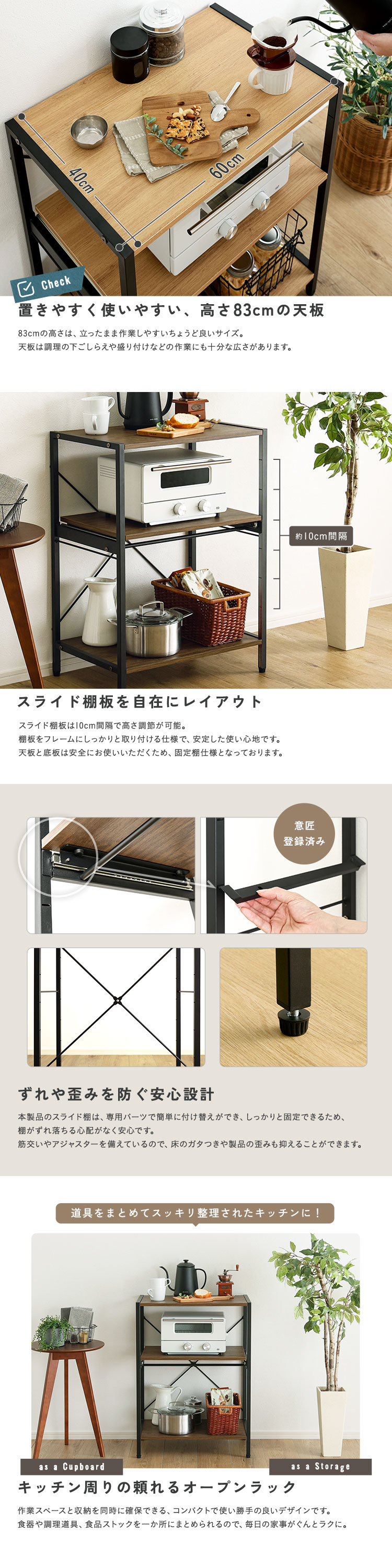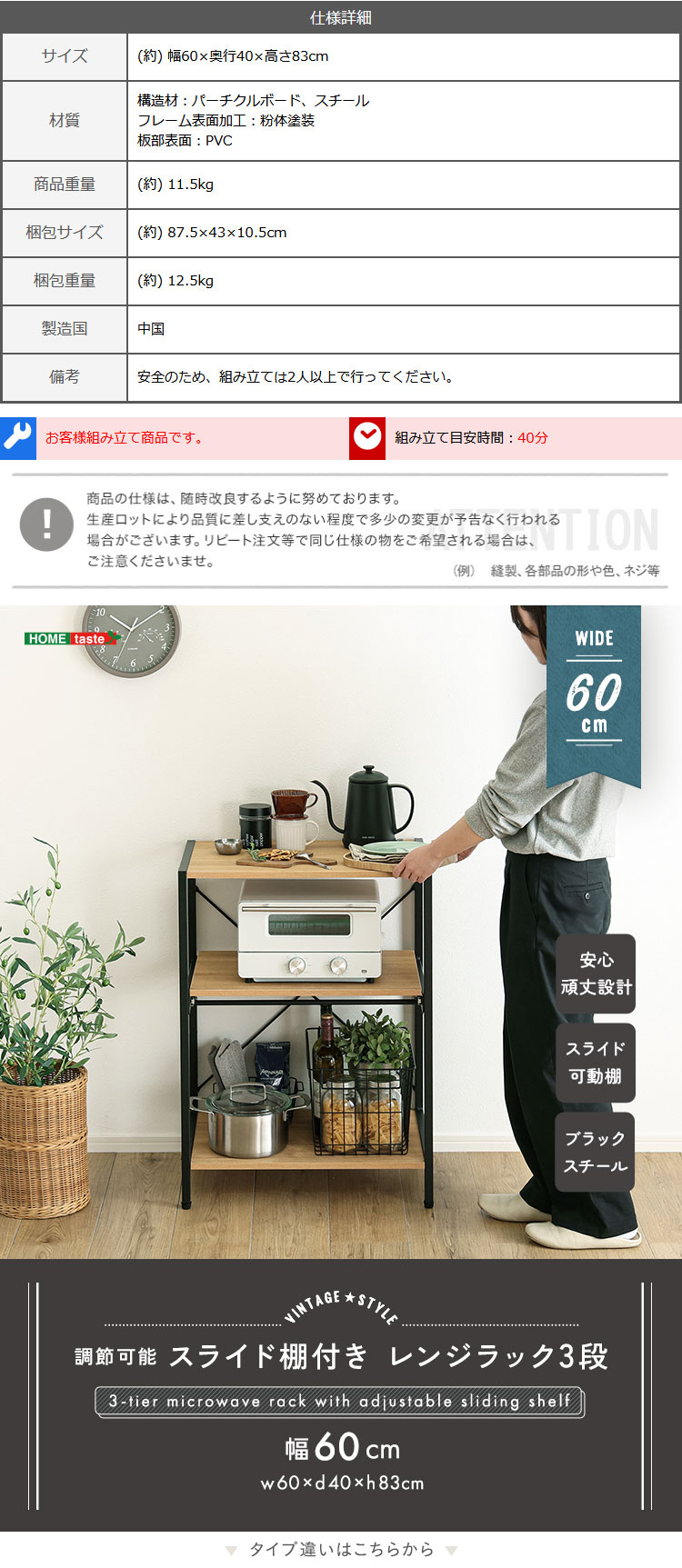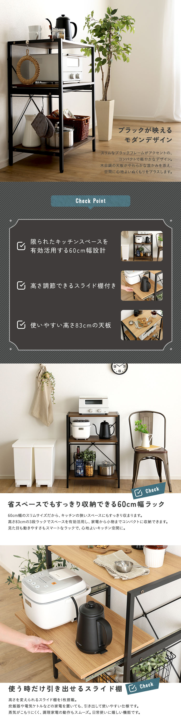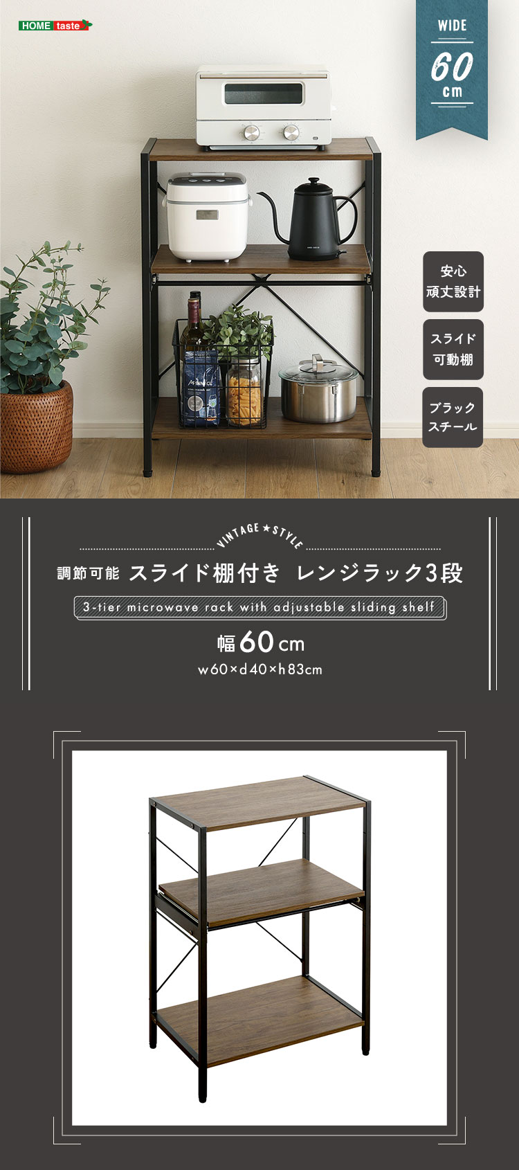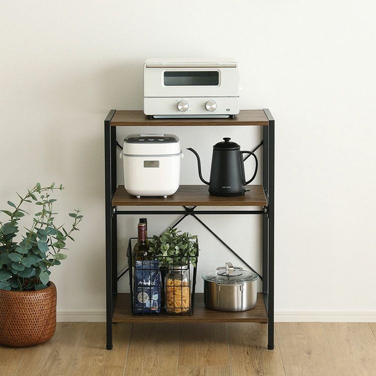 ロータイプ レンジラック 3段 省スペース 可動棚 収納 おしゃれ ラック 収納棚 デッドスペース 棚位置調節 ヴィンテージ調 調節可能スライド棚付きレンジラック3段 [VRZ-3]