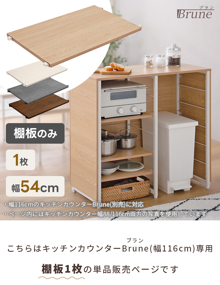 送料無料 ※北海道・沖縄県・離島は別途送料お見積り 【商品について】別売 キッチンカウンター【Brune-ブラン-】 可動棚■サイズ:(約) 幅54.1x奥行34.2x高さ1.5cm ※1枚当たり■耐荷重:棚板:約5kg/枚■カラー:ナチュラル、ウォールナット、ホワイト■素材:パーチクルボード・メラミン化粧繊維板
